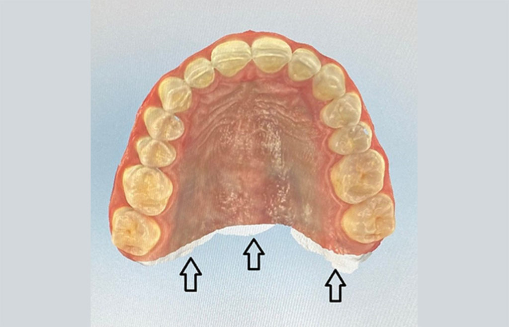 Most companies have a recommended scanning order to best have their software stitch together a digital scan – typically this involves an initial scan of the entire occlusal surface, then filling in the facial and lingual surfaces. A good scan will include the entire dentition with 2+ mm of gingiva around all teeth.
