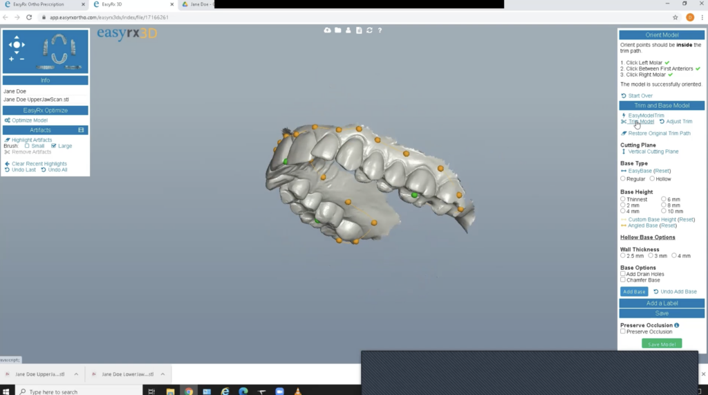 To trim the model, use the software’s trim function to remove the jagged edges. Place orange dots at the gingival line. When the line is complete, the orange dots will turn green. The goal is a nice connected, smooth surface. If you receive an error, adjust the dot placements.