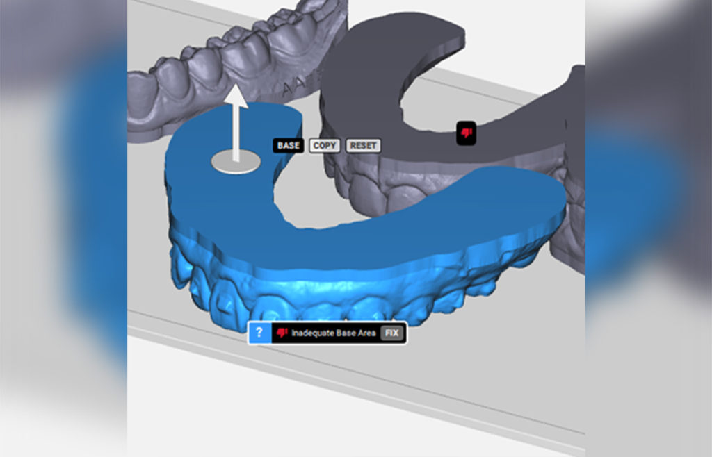 Select the base of the model (bottom of the model for horizontal printing or back of the model distal to molars for vertical printing) and set it flat to your build platform to ensure the entire base of the model is flat to the platform. Rotate the platform and confirm that the base of the model is visible in its entirety.