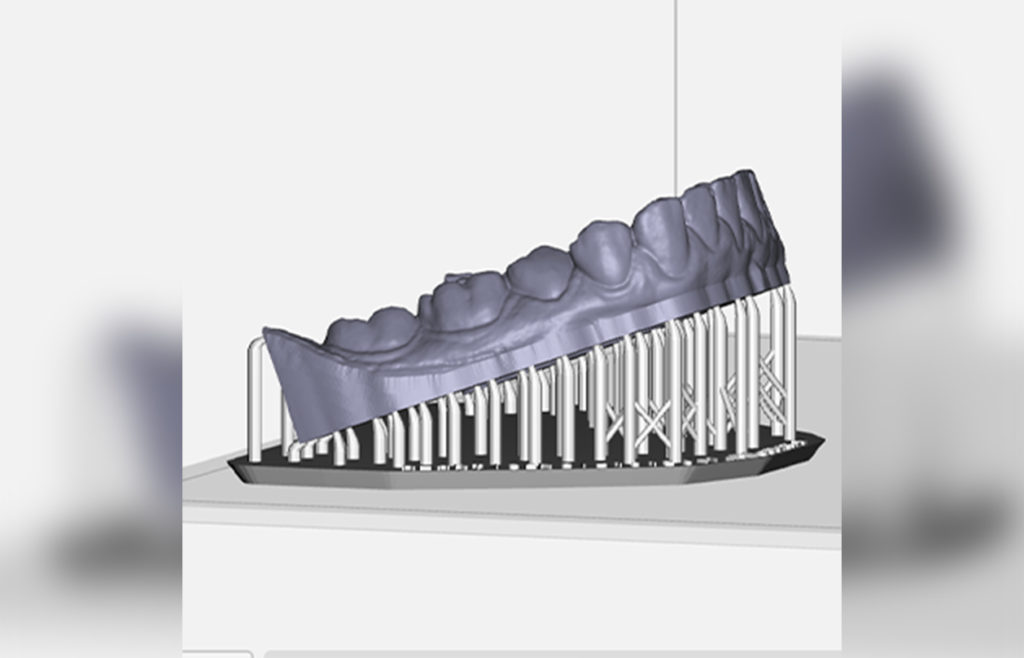 In the 3D printer software, select the model and click on the supports icon. Select the desired support options and apply them to the model. For printing dental models, this is rarely required.