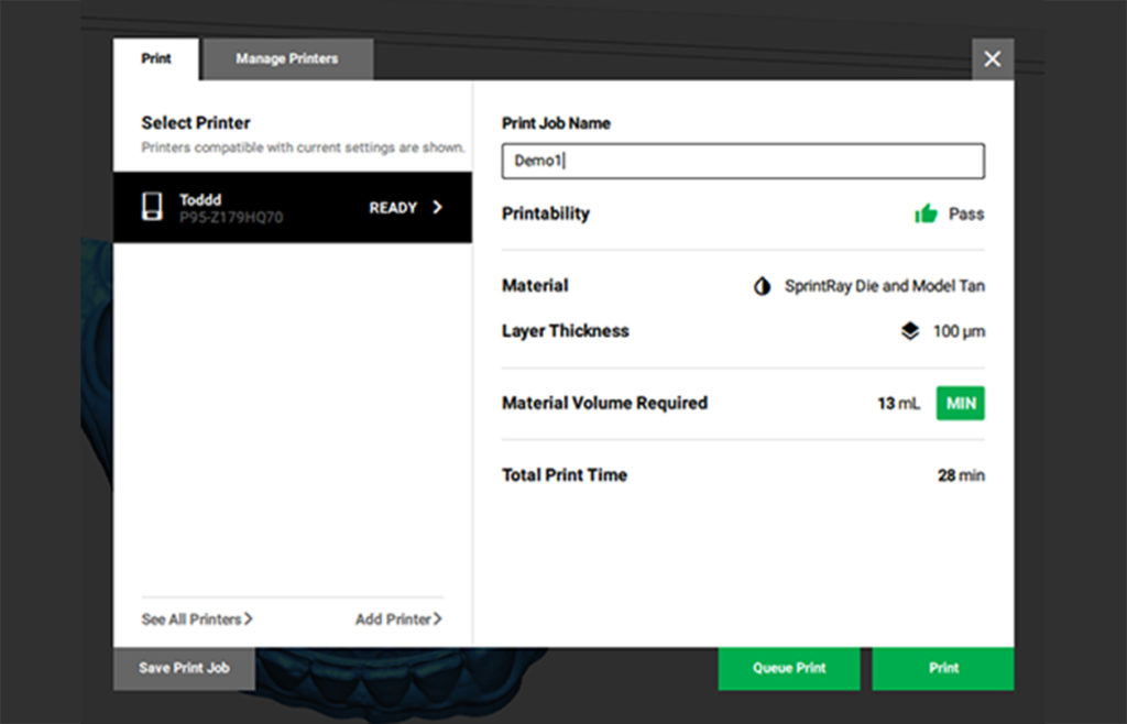 In the printer settings, select the material resin and layer thickness you would like to use for the print job. Click on the print icon to send the models to be printed. If the printer is set up via an ethernet cord or wirelessly the print will be sent automatically. If not, save your model file to a USB for printing and directly place the USB in your 3D printer to start your print job.